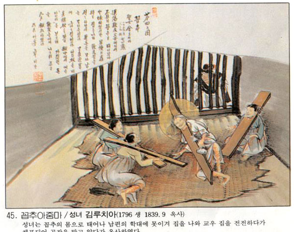 | Çѱ¹ õÁÖ±³È¸ÀÇ 103¸íÀÇ ¼ºÀÎÁß ÇÑ»ç¶÷.±è ·çÄ¡¾Æ´Â ¼¿ïÀÇ °¡³ÇÑ °¡Á¤¿¡¼ ž´Âµ¥ ž ¶§ºÎÅÍ ¸öÀÌ ºÒ±¸¿´´Ù. ±×·¡¼ ¡®²ÅÃß ·çÄ¡¾Æ¡¯·Î ºÒ·È´Ù. 1801³â ½ÅÀ¯¹ÚÇØ ÀÌÀüºÎÅÍ ÃµÁÖ±³¸¦ ¹Ï¾úÀ¸³ª ³²Æí°ú °¡Á·µéÀÌ ¸ðµÎ ¿Ü±³ÀÎÀ̶ó ½Å¾Ó »ýȰÀ» Á¦´ë·Î ÇÏÁö ¸øÇÏ¿´´Ù. °á±¹ ÁýÀ» ³ª¿Í ±³¿ìµéÀÇ Áý¿¡ ¾ñÇô »ì¸é¼ º´ÀÚ ...